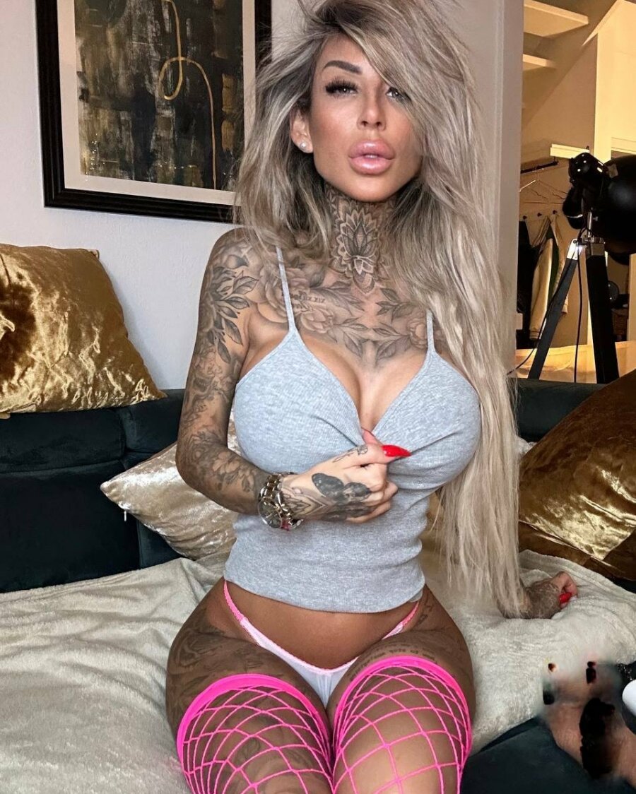 This gallery contains 12 high-quality images featuring Tattooed amateur babe poses in pink fishnets & flaunts her hot legs & cleavage. Browse this Model gallery