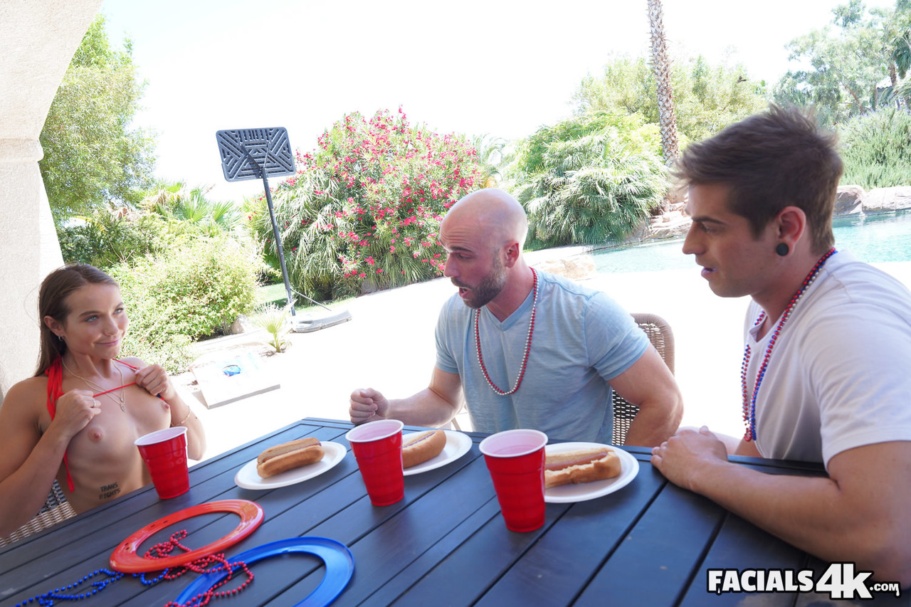 Little nympho Violet Moore gets spit roasted & facialed in a swingers party