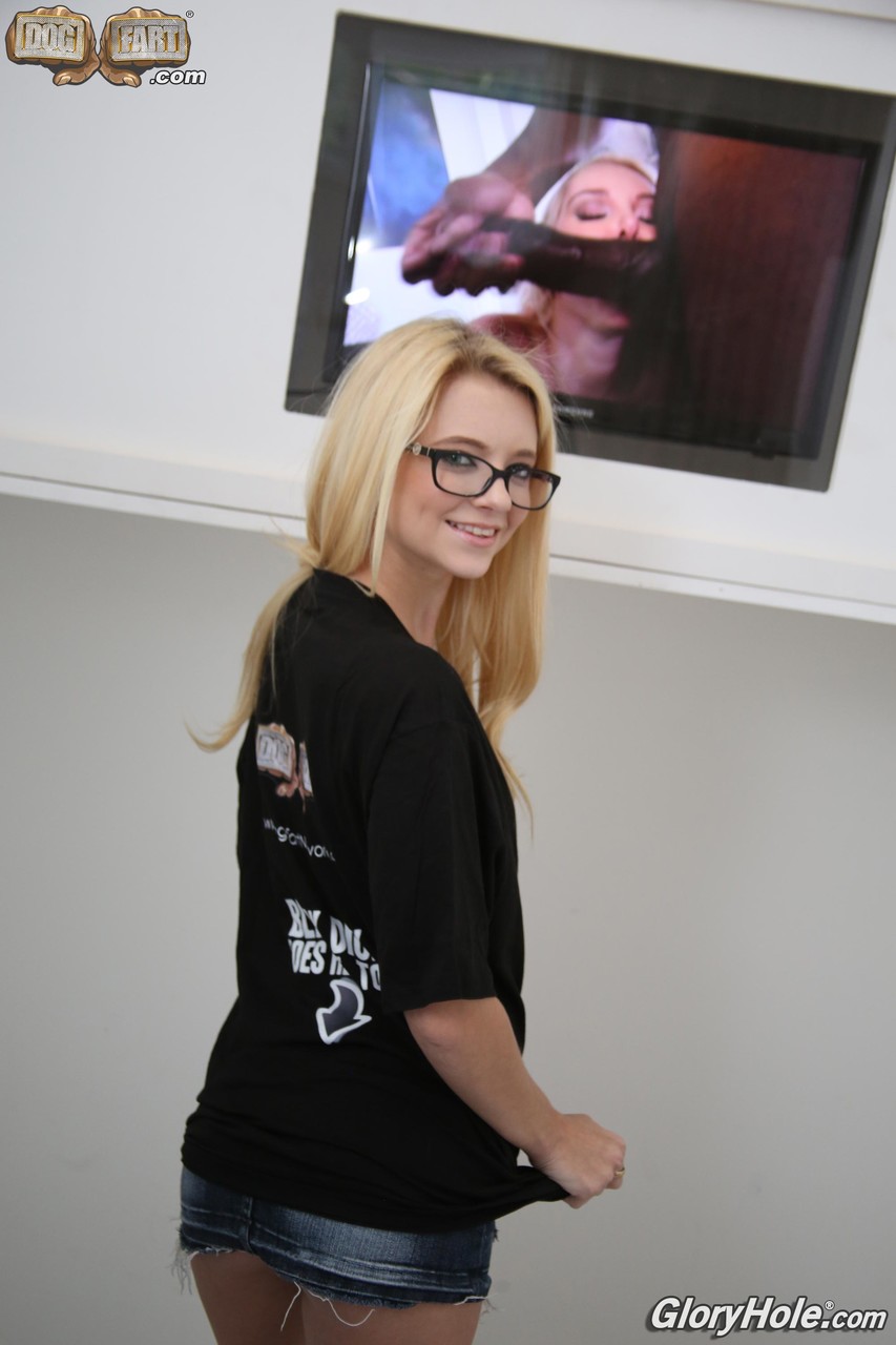 Petite Riley Star lets a BBC sperm on her pretty pretty face in glasses at a gloryhole