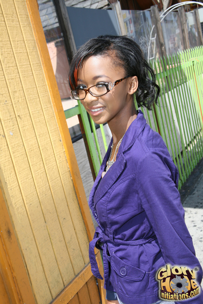 Black slut girlfriend broad Becky Cohen wears glasses while having sex at a gloryhole