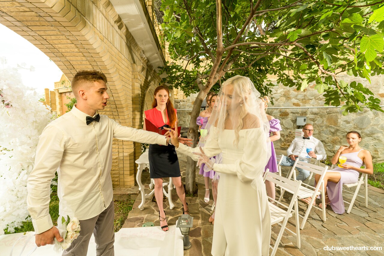 Sleazy blonde bride kisses her best husband man stud and takes his meat in white nylons