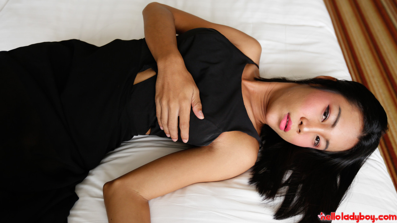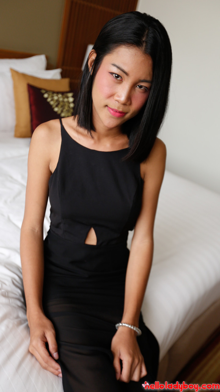 Pretty charming oriental t-girl shows her thin body in a pretty black dress & in fishnets