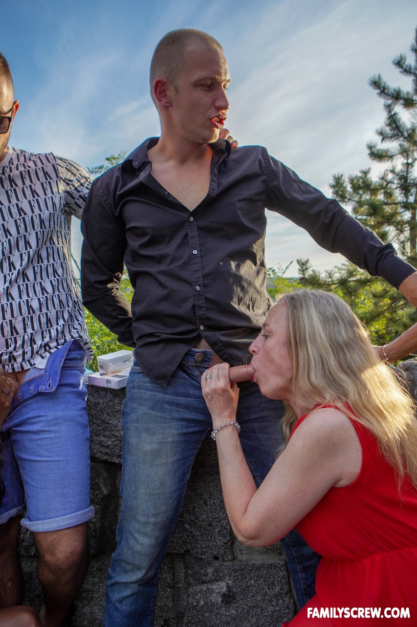Old skank Valentina Sierra gives a bj in a slutty outdoor orgy