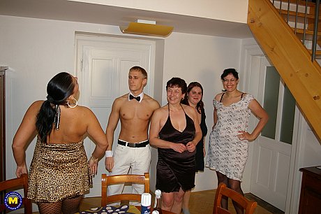 Four amateur cougars in hot stockings fucking young teen blond lover together