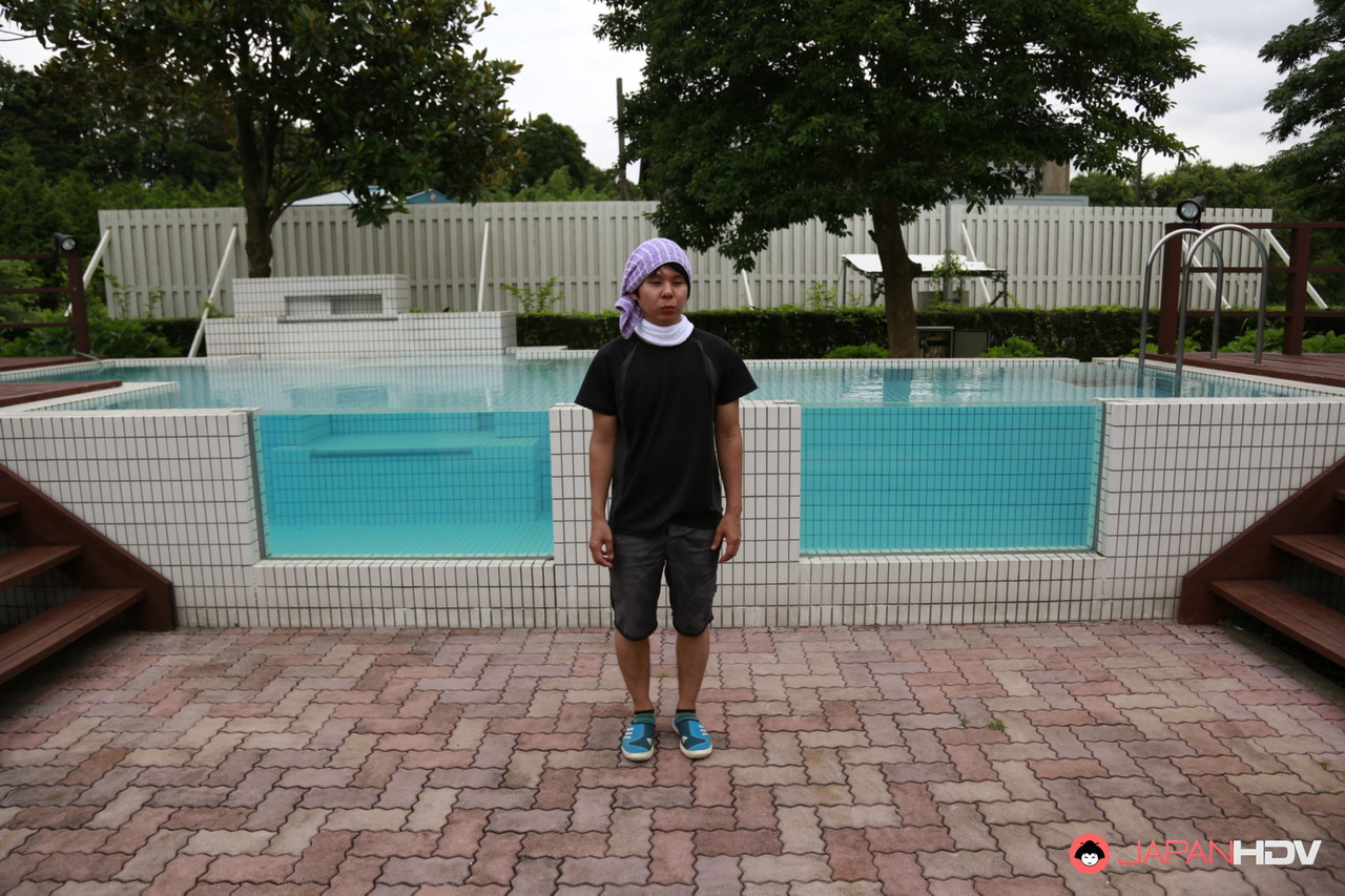 A bunch of Japanese beauties pose in the nude in front of a swimming pool