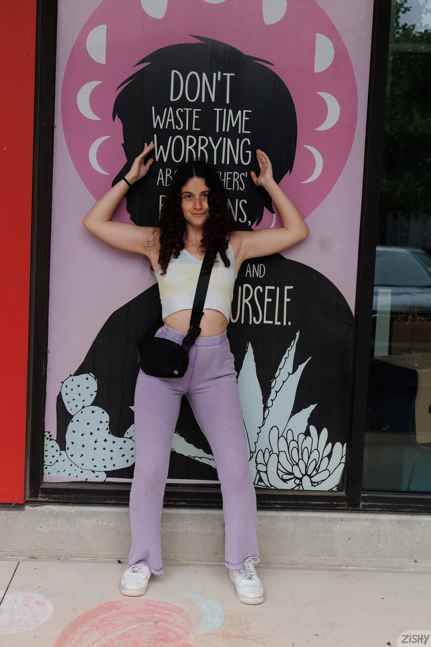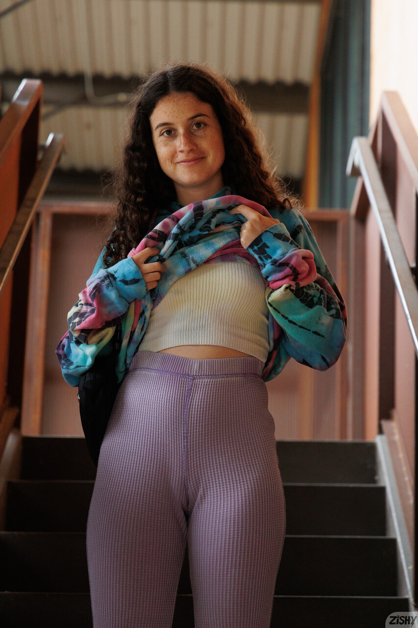 Gorgeous charming curly haired babe Gabriella Noren shows her tiny titties and her monstrous behind