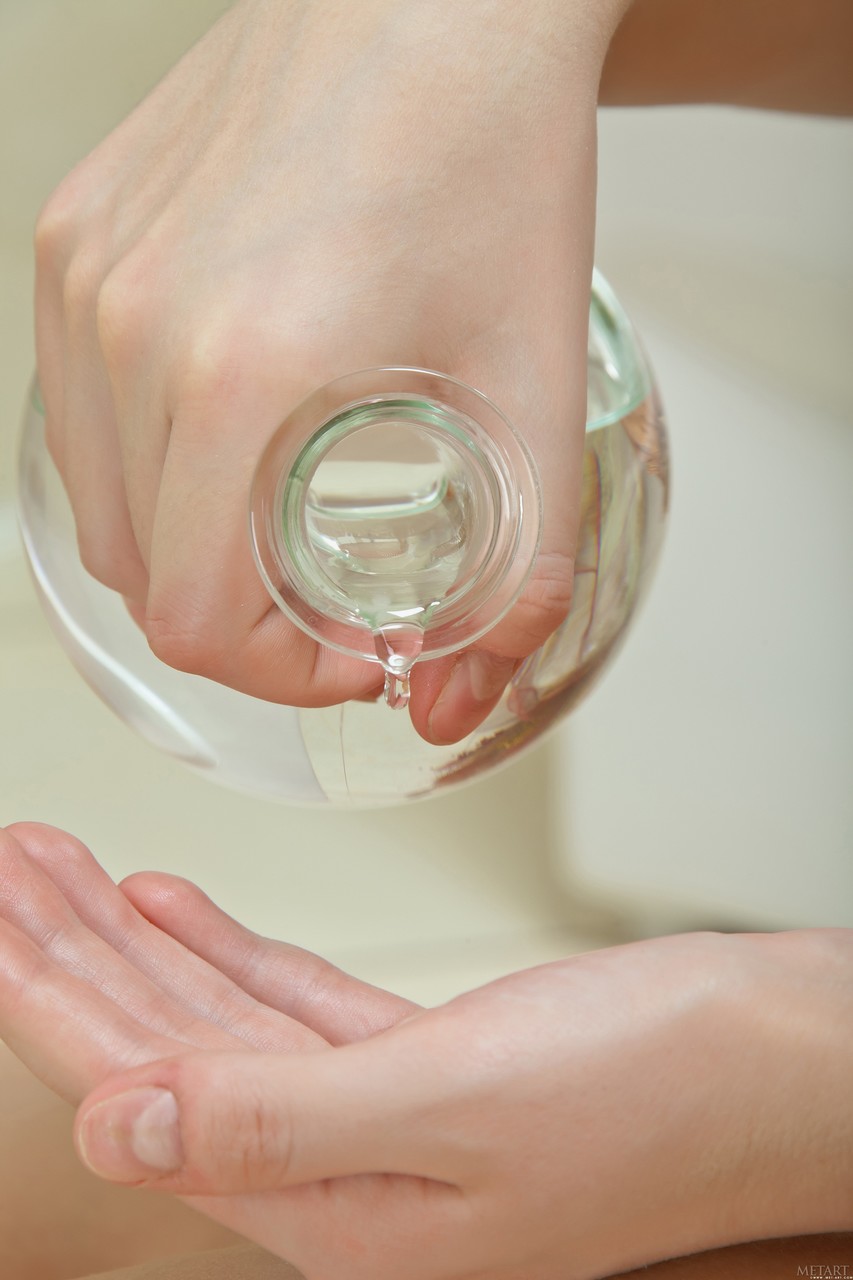 Teenie babe Sabina B oils up her puffy nipples & her fine body in the bathroom