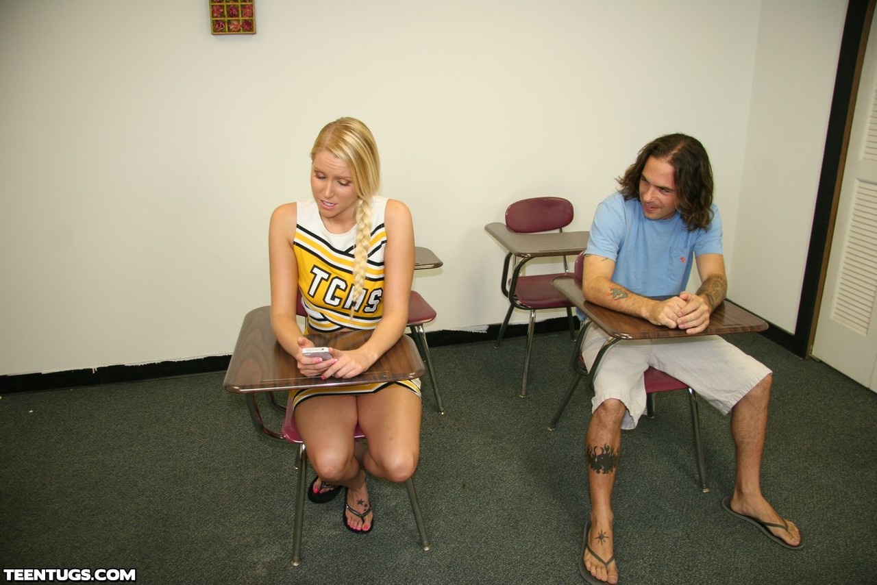 Sexy cheerleader Vanessa cell kneels down & gives her classmate a handjob