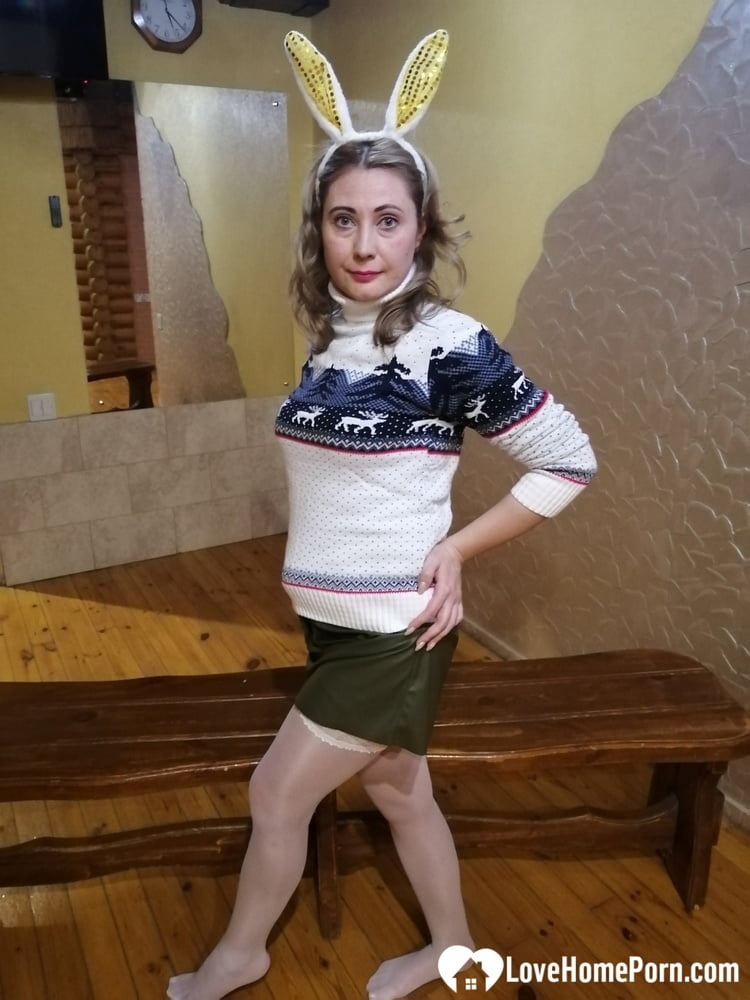 Amateur ex-wife with bunny ears posing in her white nylon leggings