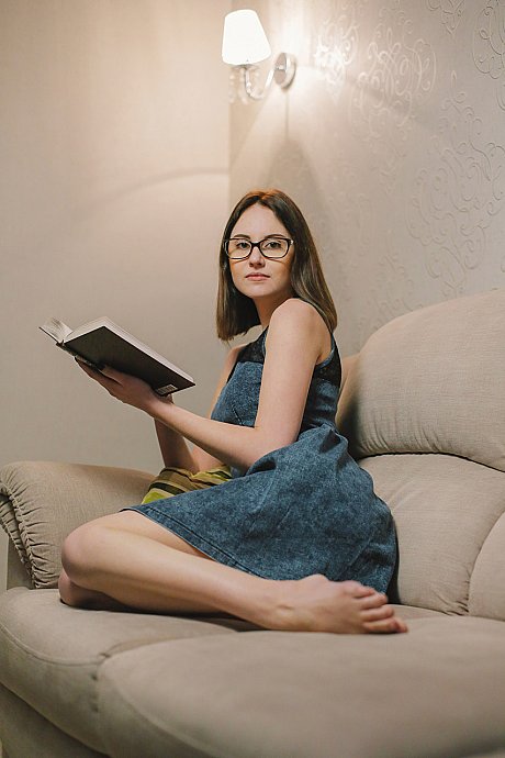 Young nerdy chick gf girl Sade Mare plays with her small twat after reading a book