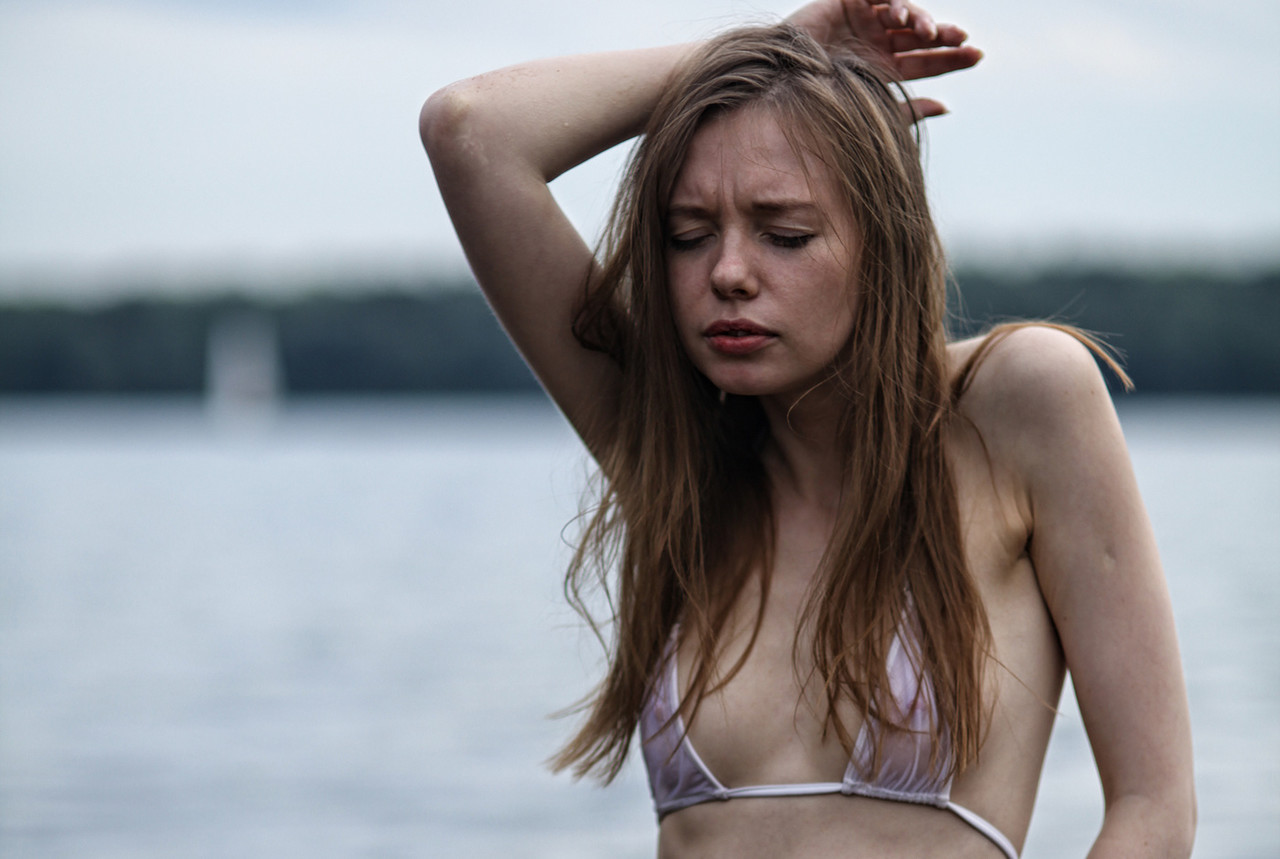 Skinny brunette young posing in her tiny white bikini in the sea water