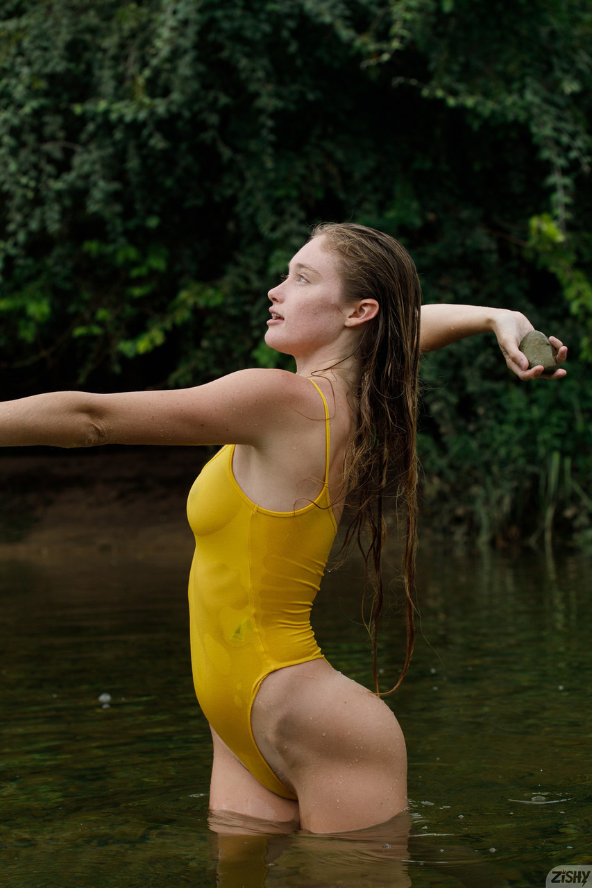 Lovely curly haired babe Suzie Hartford and her girl swim in a river