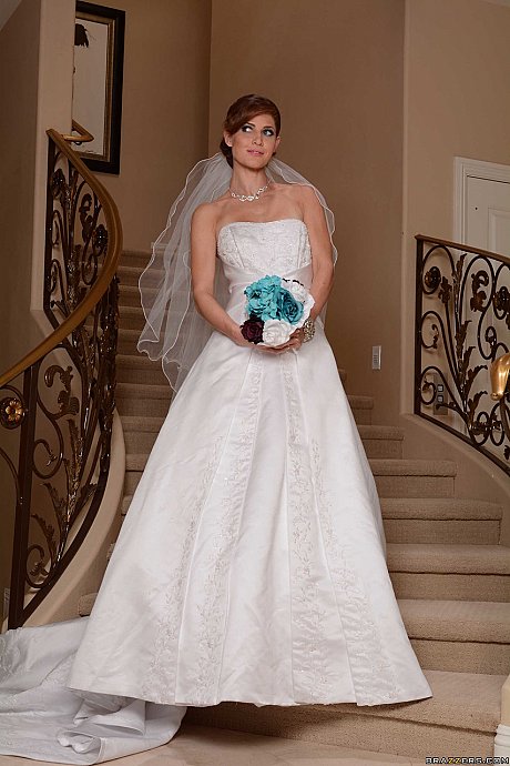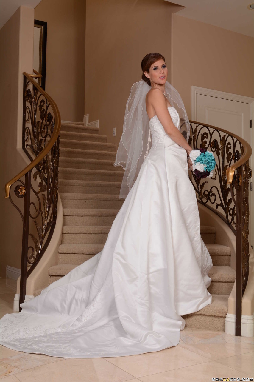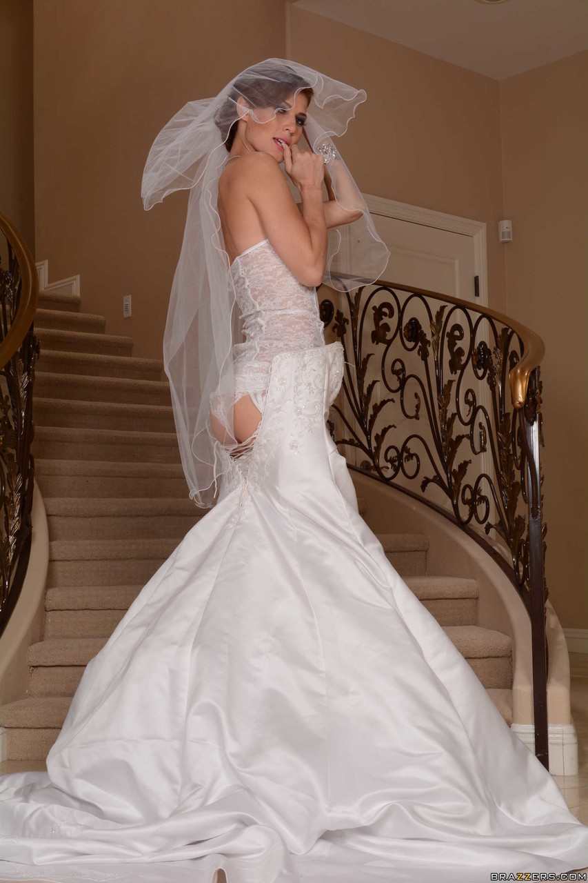 Glamorous wife in a bride outfit Jenni Lee rubbing her smooth cunt