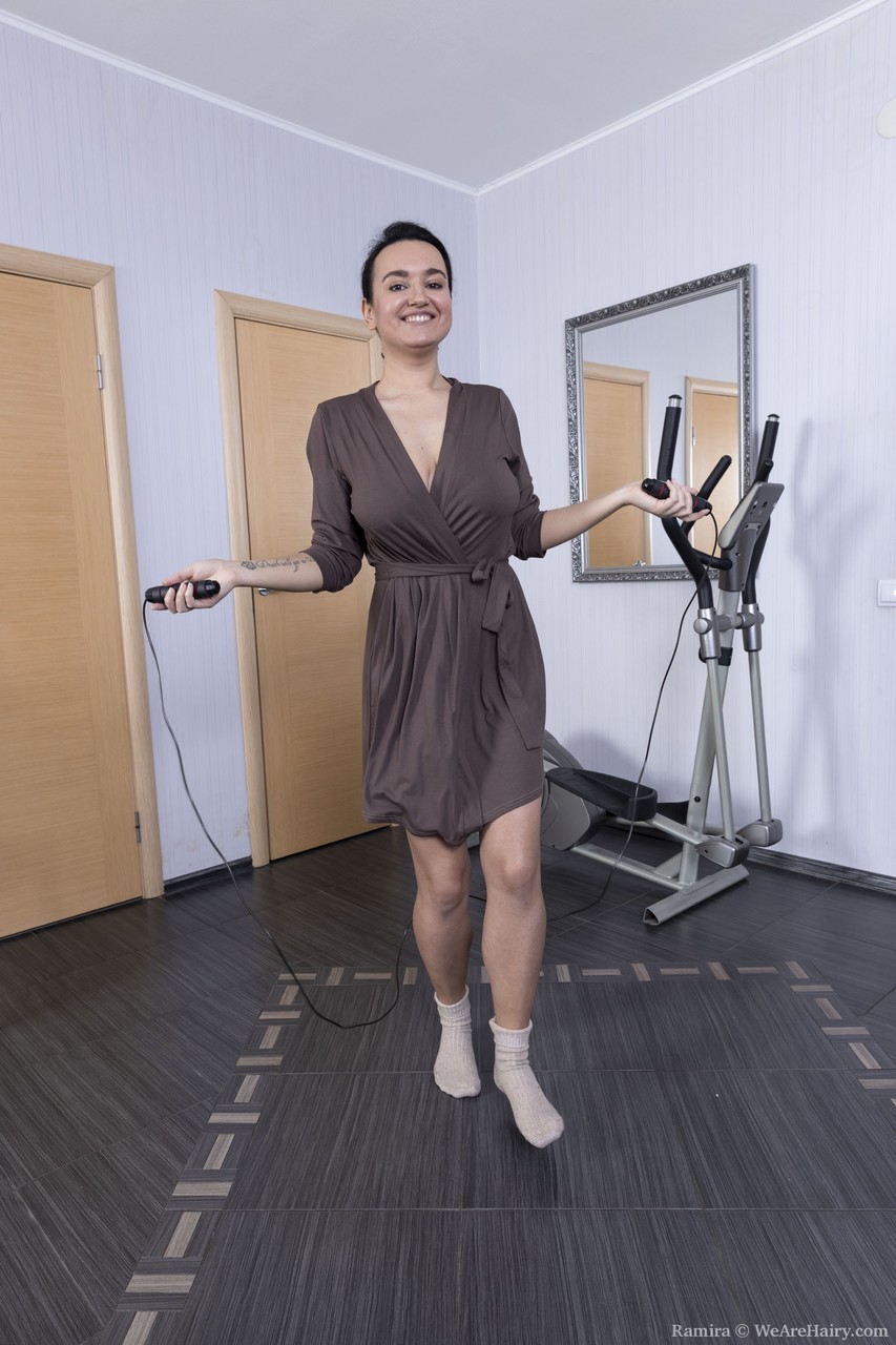 Short-haired amateur Ramira strips after her workout & shows her hairy cunt