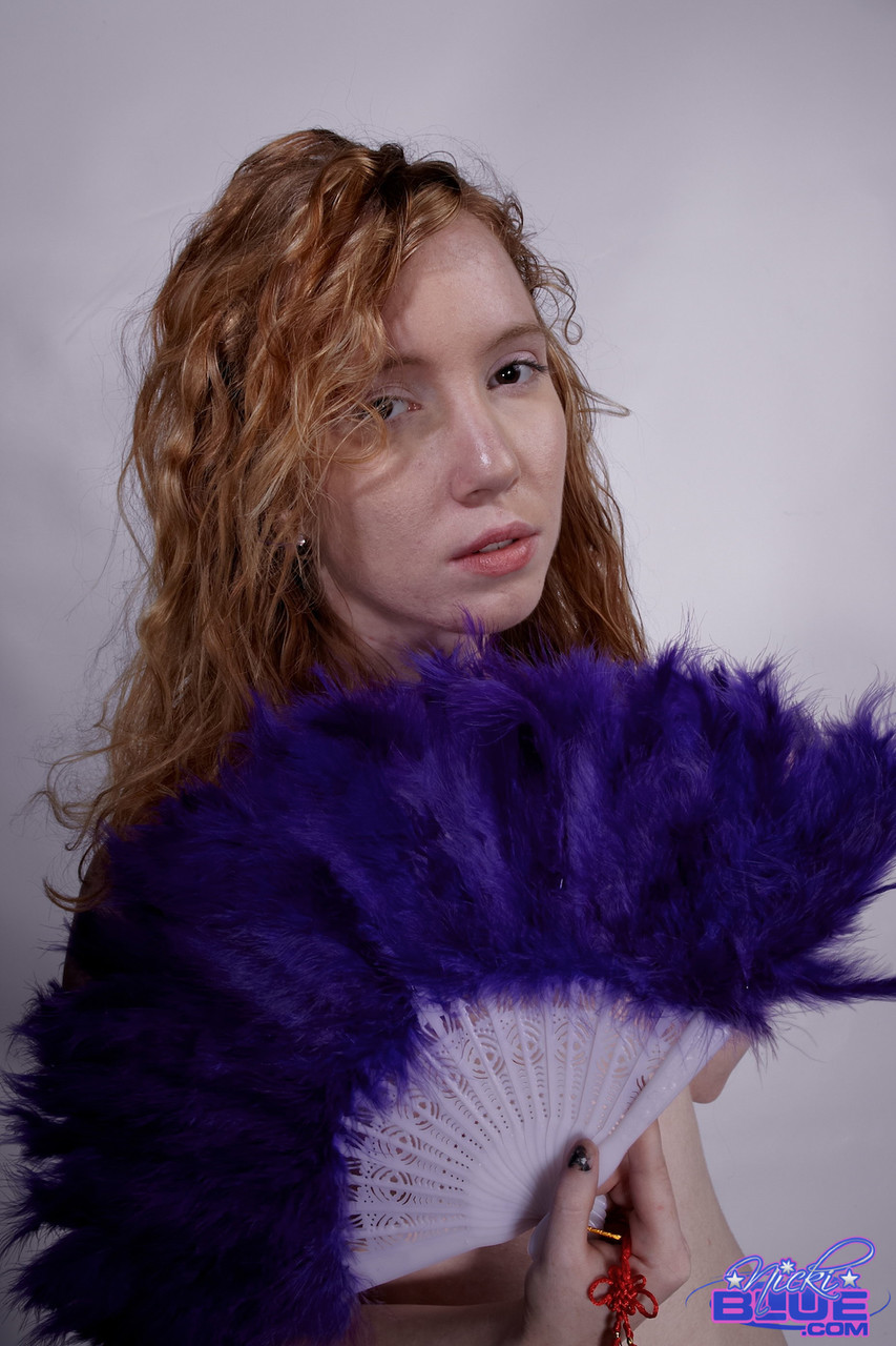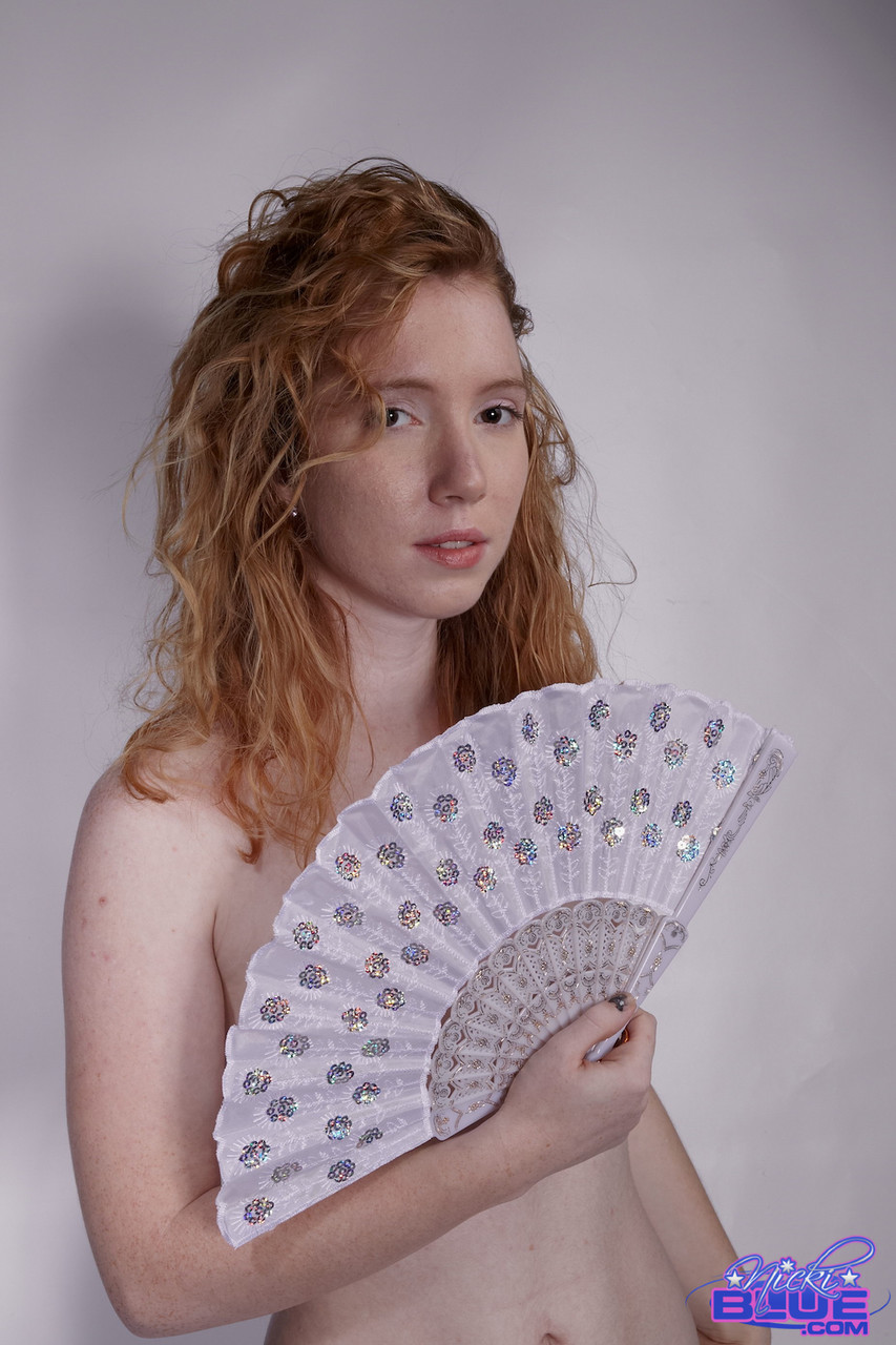 Natural ginger head Nicki Blue fans herself while modeling for a undressed solo shoot