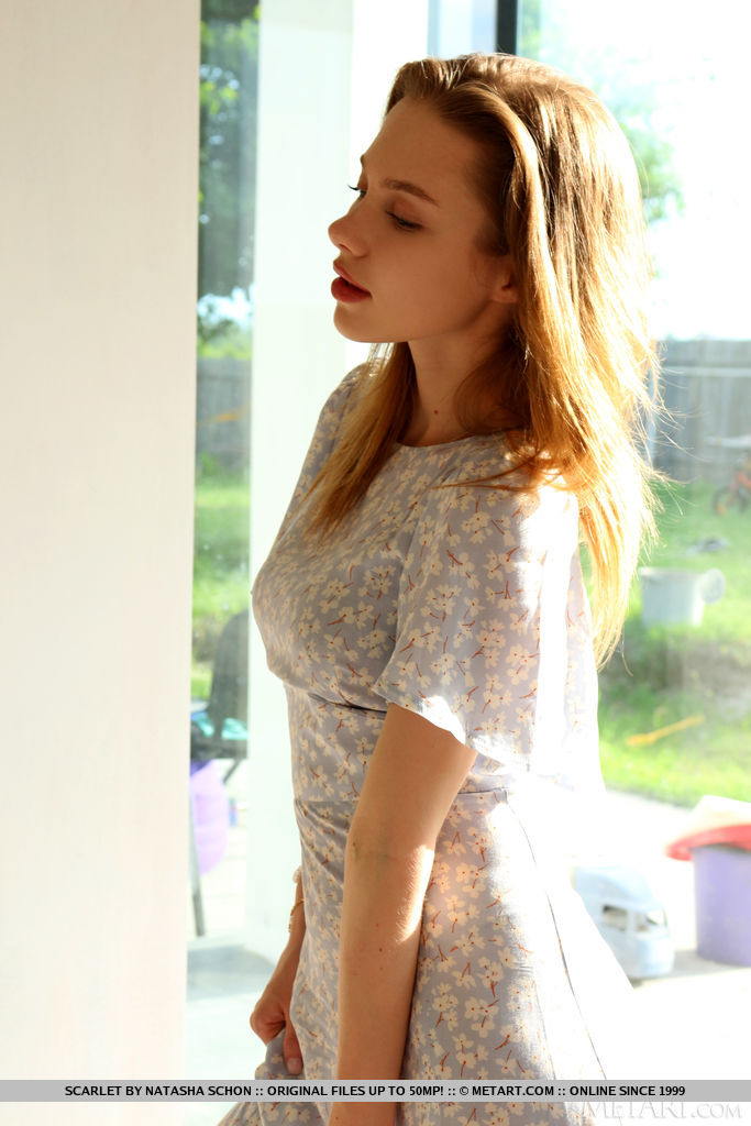 Ravishing teenie Scarlet removes a long see-through dress to model in the undressed