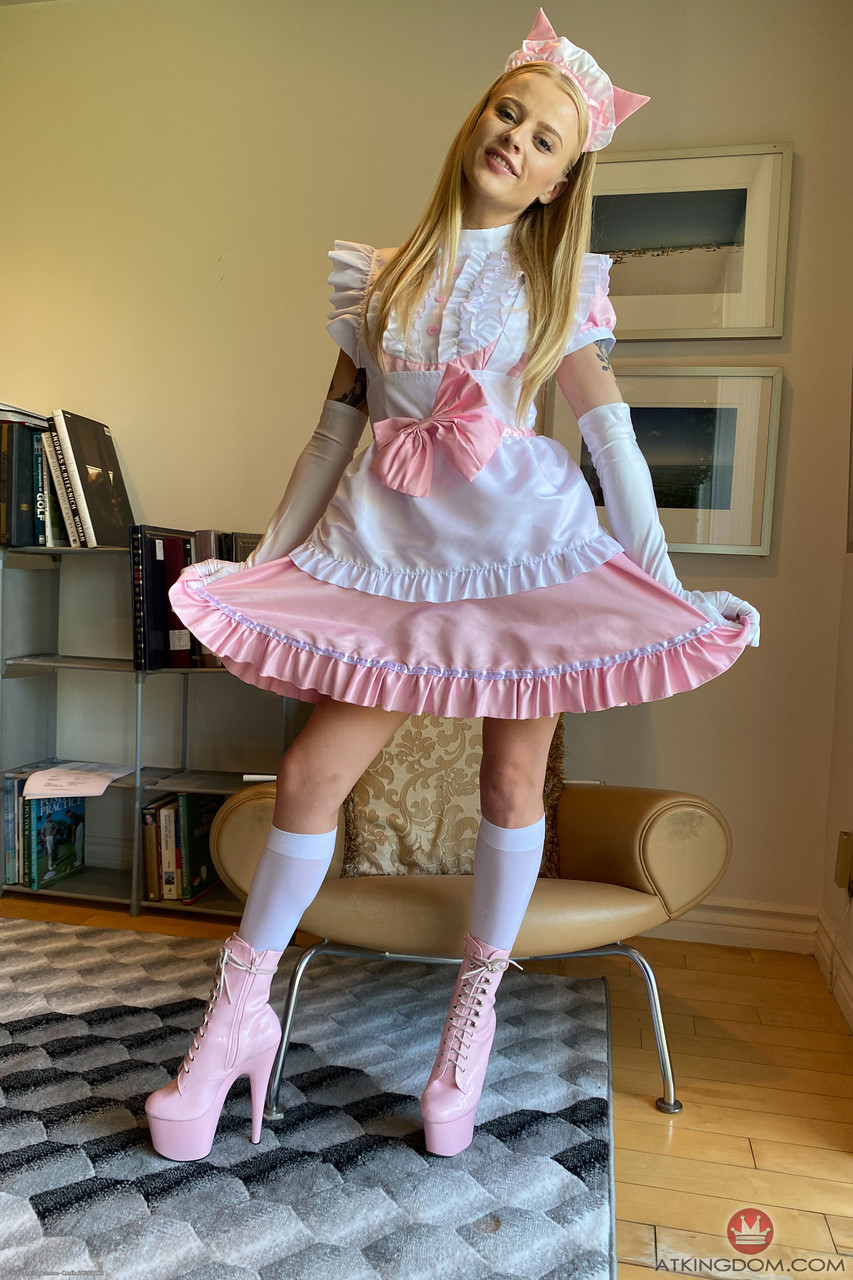 Sweet teenie maid Paris White poses in her hot uniform and shows her holes