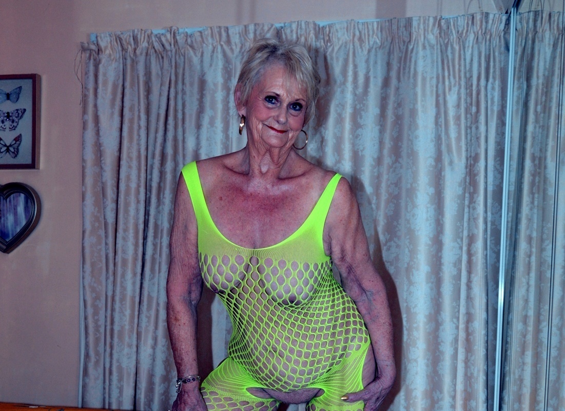 Blondy grandmother Sparkle models a revealing outfit on her bed