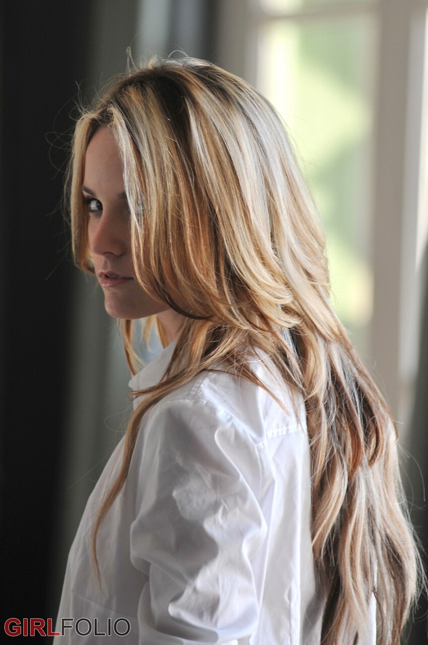 Hot yellow-haired Sarah James pulls down her pantyhose to show her trimmed muff