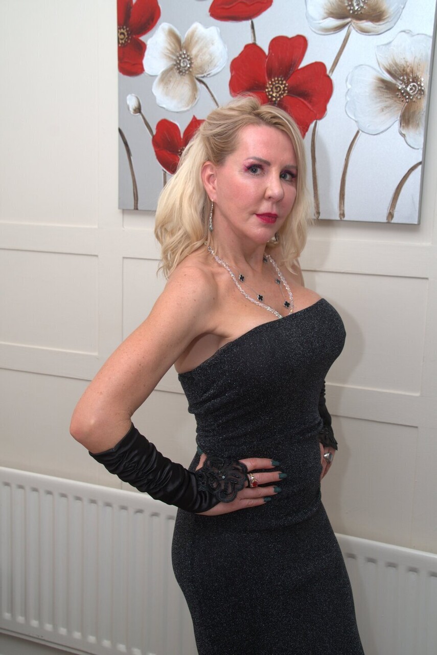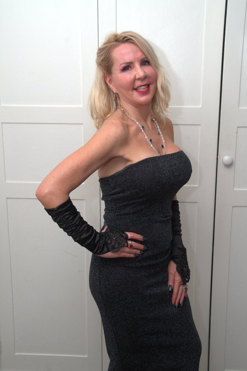 Old blondy Emerald models a Christmas outfit before a black hubby boy man kisses her