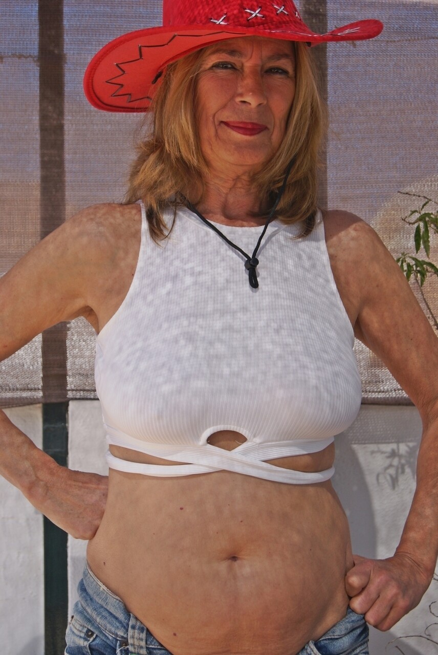 Mature woman Marta Style exposes her boobs and cunt on a sunny deck