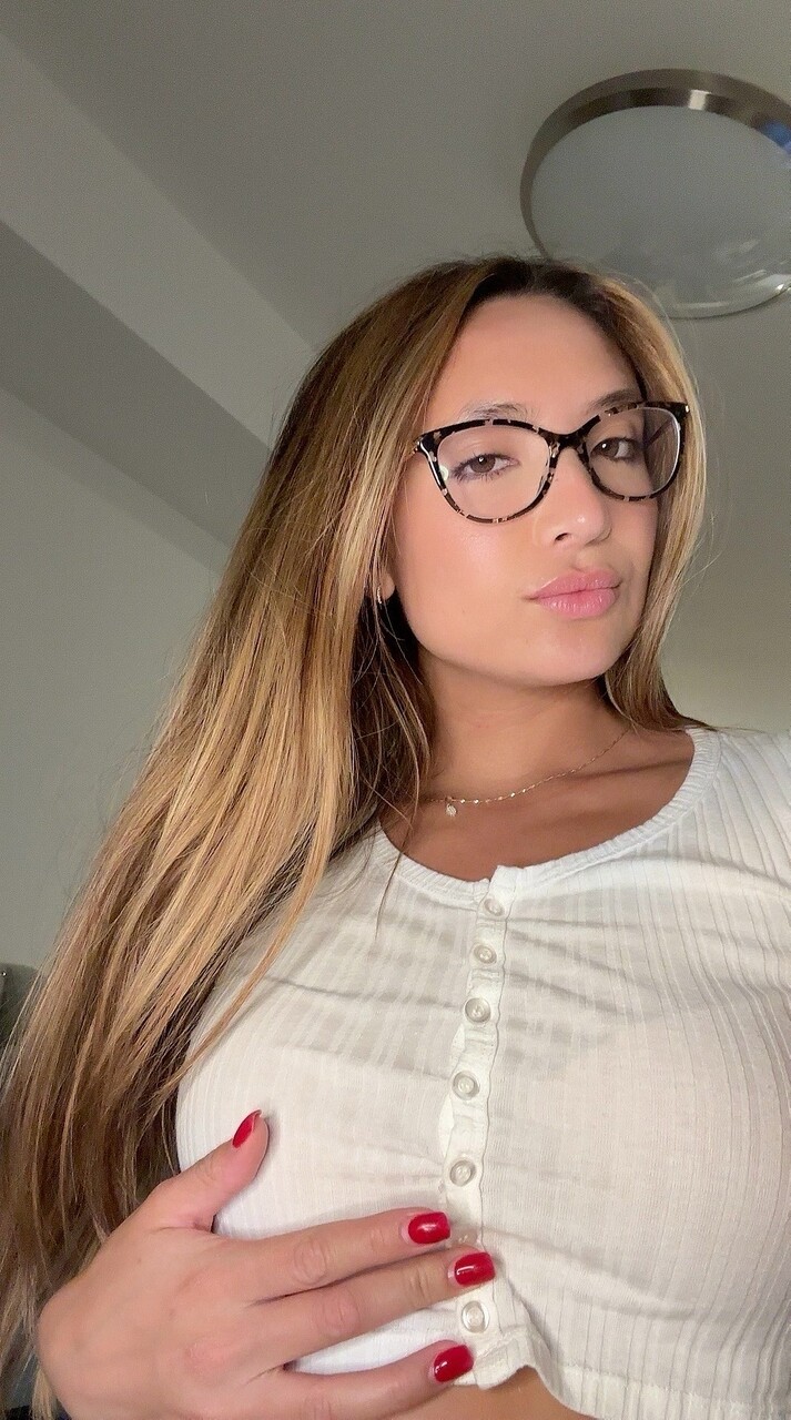 Nerdy OnlyFans babe Bia Bangs Free shows her hot cleavage & booty in a solo
