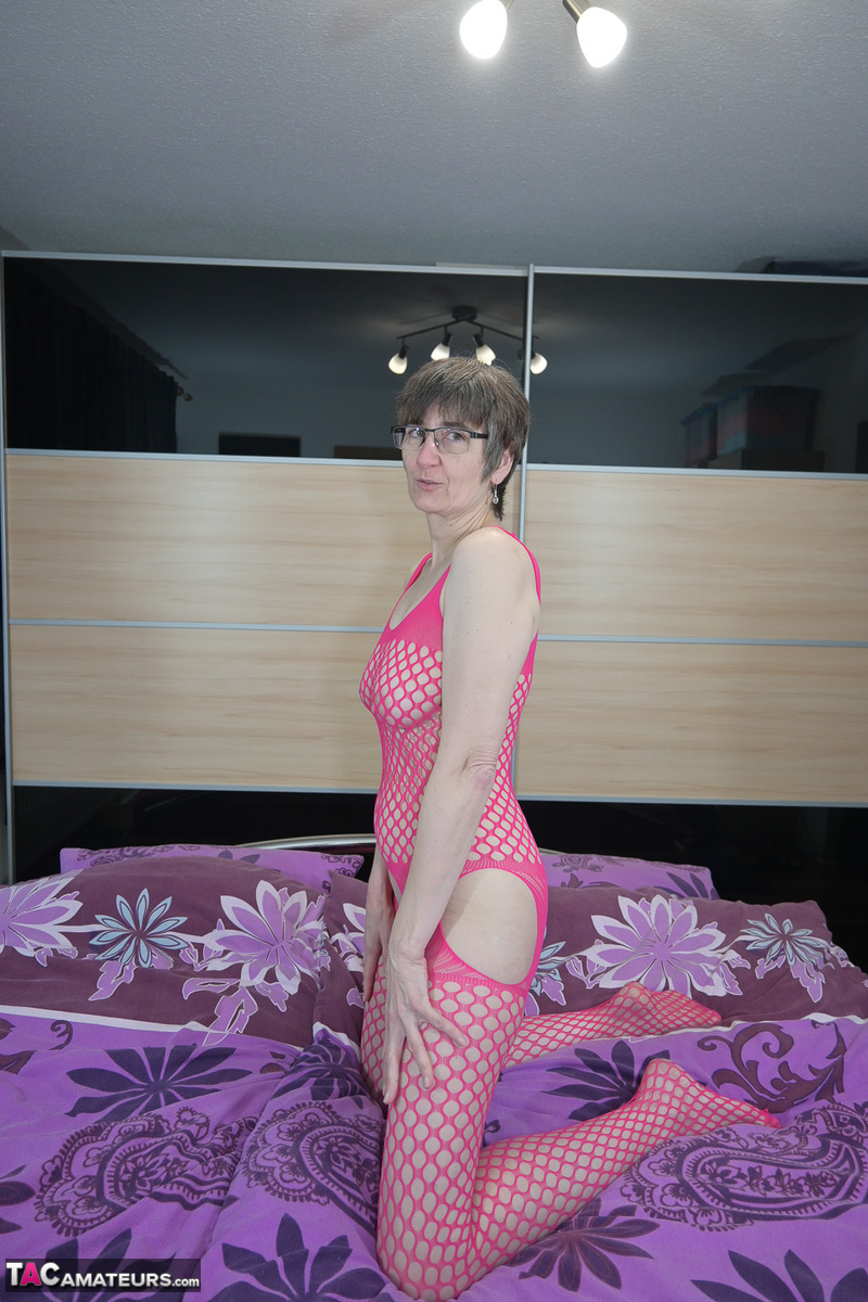 This gallery contains 16 high-quality images featuring Cougar amateur shows her hairless pussy while wearing a crotchless bodystocking. Browse this Masturbation gallery featuring Hot Milf.