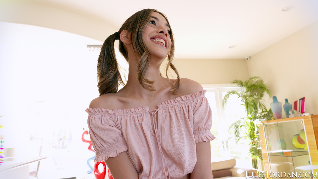 Thin Ember Snow welcomes Dredd's giant black dong pole in her tight snatch
